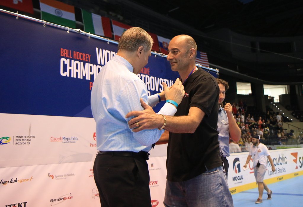 Karel Manhart při přebírání zlatých medailí s reprezentací žen v Pardubicích 2017. Zdroj fotky: Pardubice2017.